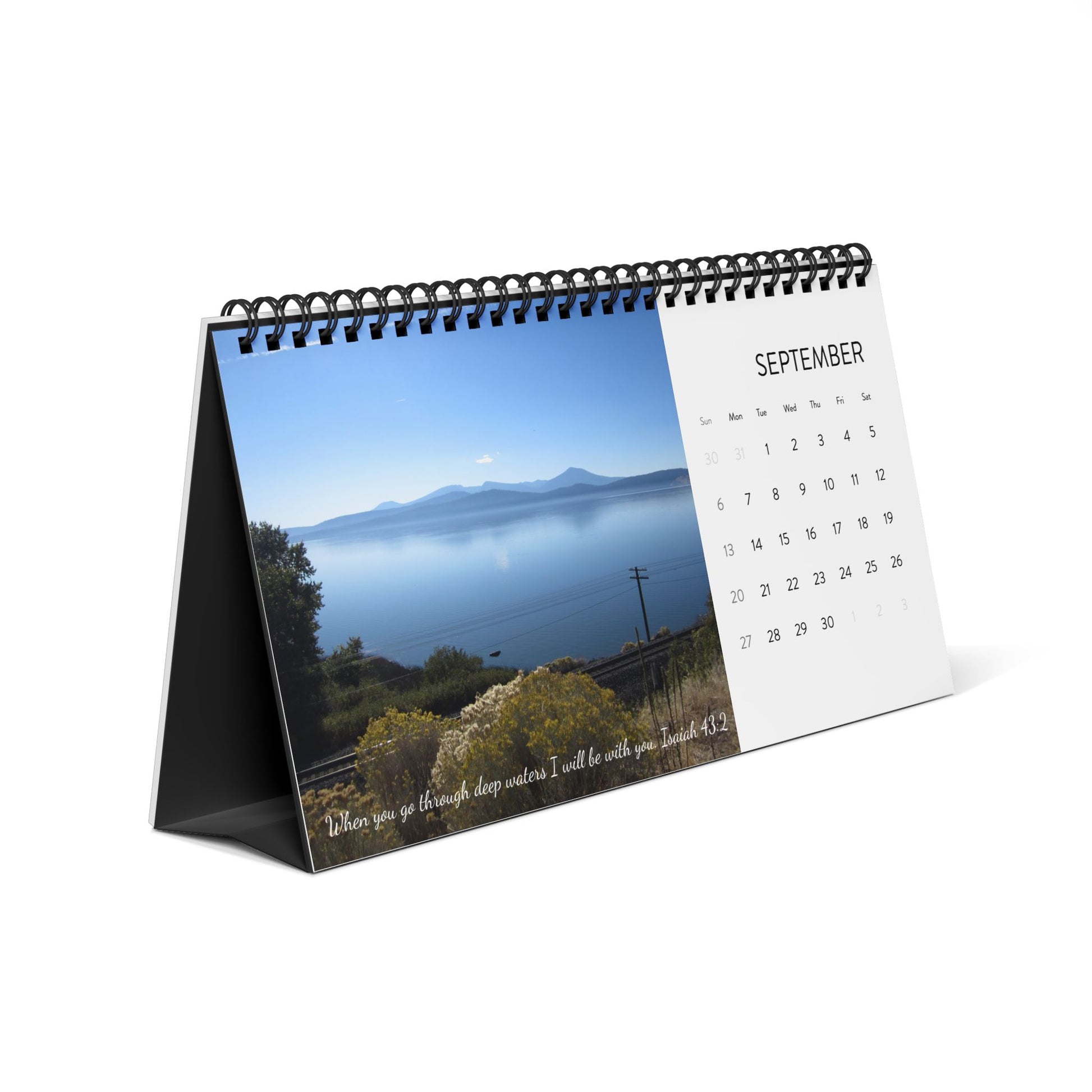 Bring a quiet moment of clarity to your desk with this 2026 desktop calendar. Each month pairs a wide-format landscape photo with a clean, easy-to-read month grid — simple, uncluttered, calming. The matte 250 gsm pages let colors breathe without glare, so those deep blues and distant ridgelines feel like a small window to the outdoors. The black metal spiral and tent-card backing create a stable, elegant display that folds neatly into a compact footprint. Made and assembled in the USA from thoughtfully sourced parts, this calendar is built to sit with you through the year, marking days while offering a steady breath of scenery.