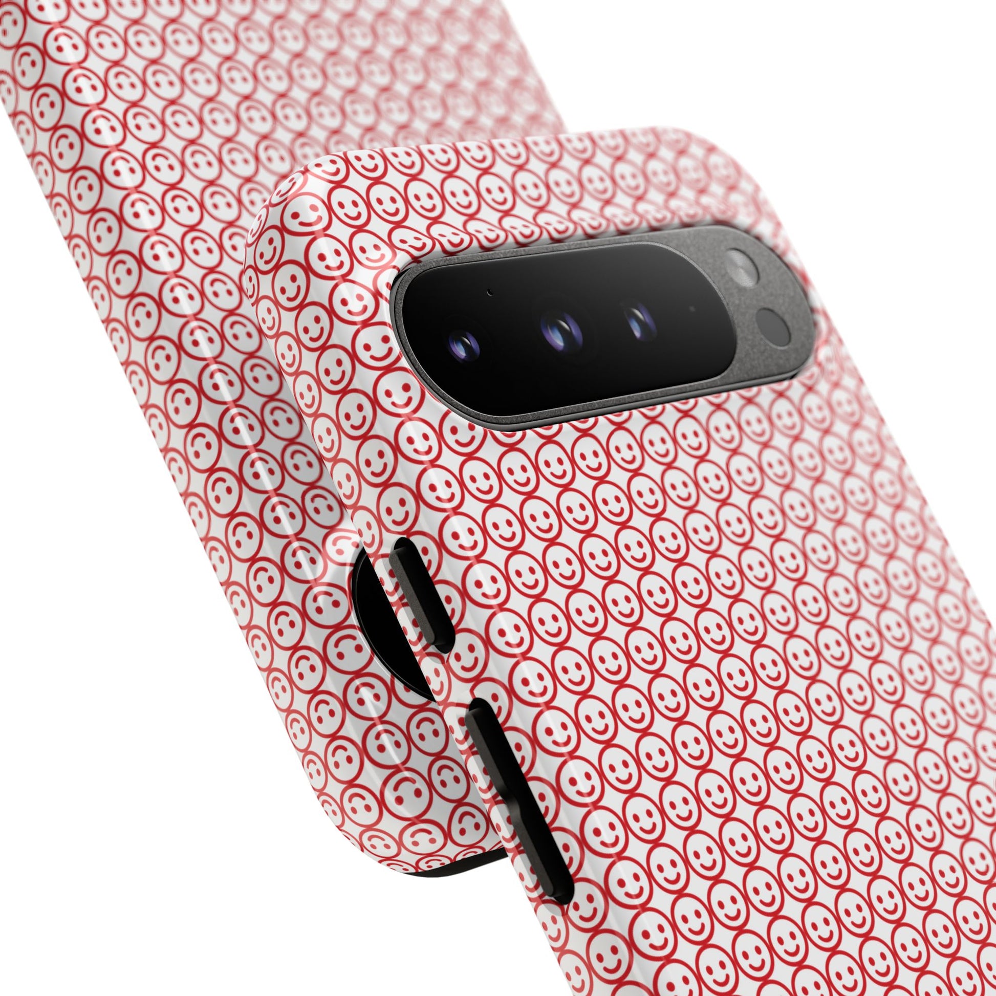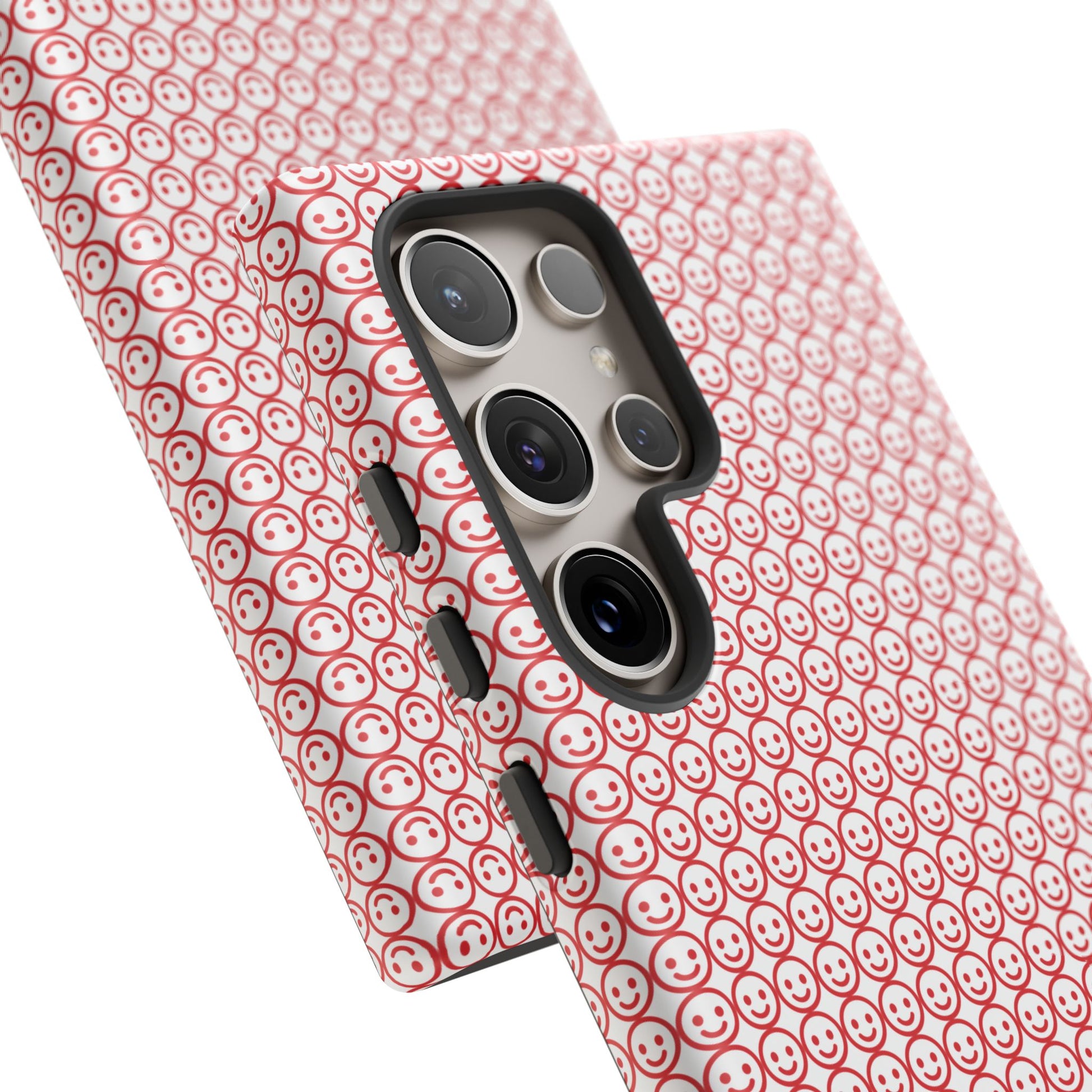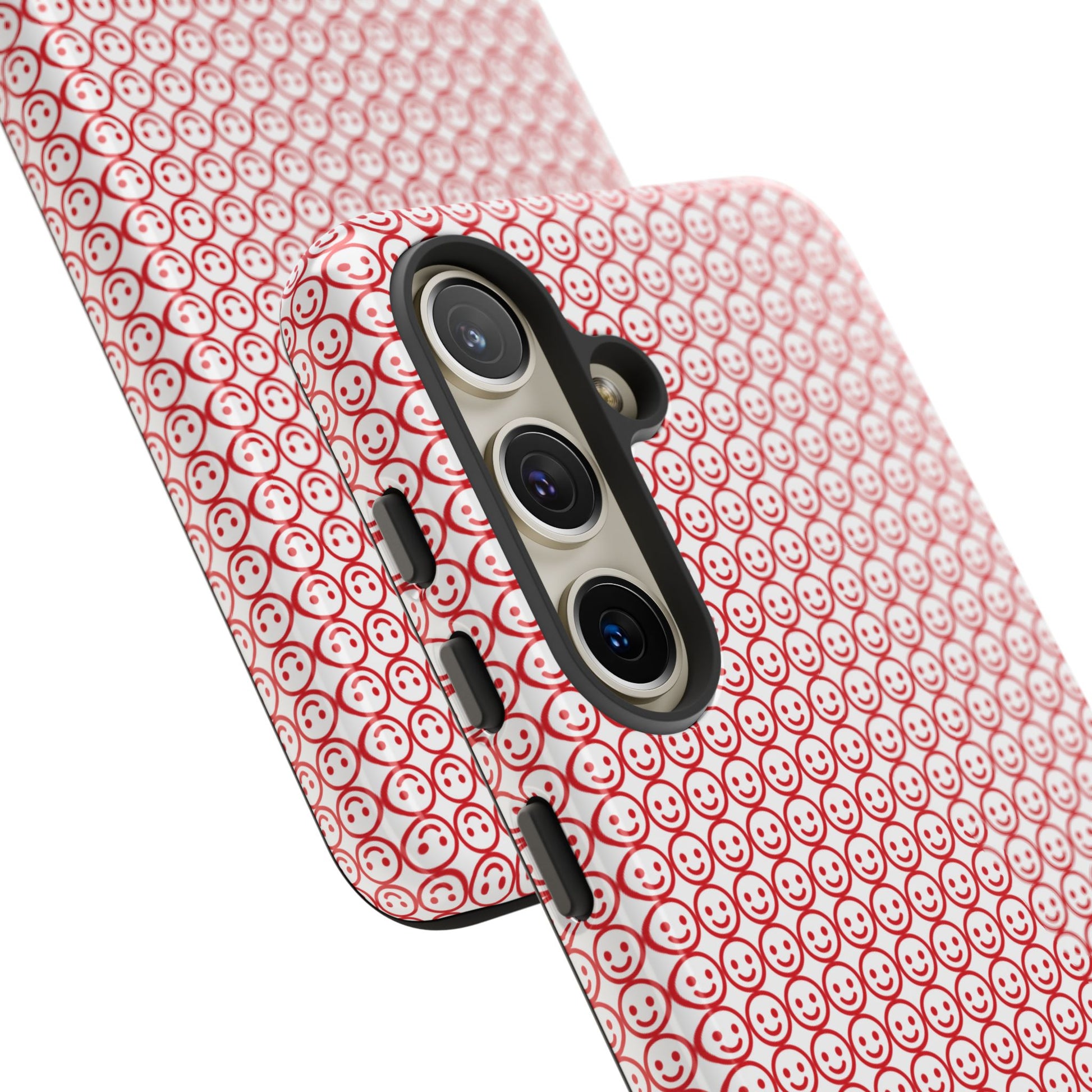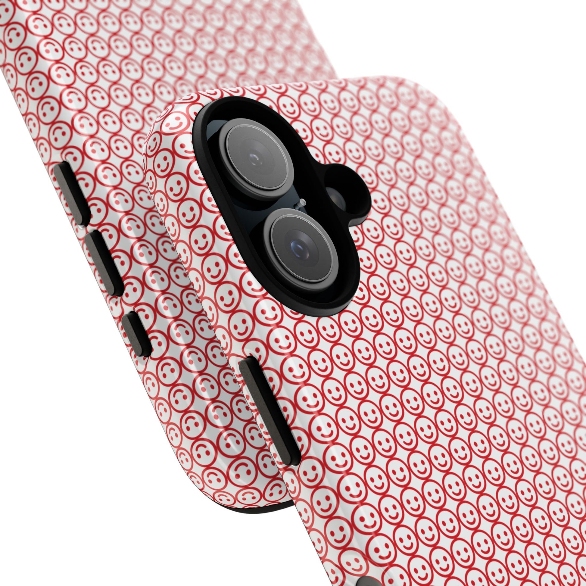 This slim yet rugged phone case brings playful energy to your everyday carry. A dense field of tiny smiley faces wraps edge-to-edge in a saturated red and white print, turning your device into a cheerful statement without sacrificing protection. The dual-layer construction — a hard polycarbonate shell with a soft TPU silicone liner — cushions impacts while keeping ports accessible and wireless charging available. UV-resistant inks preserve the lively pattern outdoors, and the glossy or matte finishes let you choose the exact look and feel you want. Thoughtful durability and certified materials mean this case stands up to daily knocks while keeping a lighthearted mood in sight.
