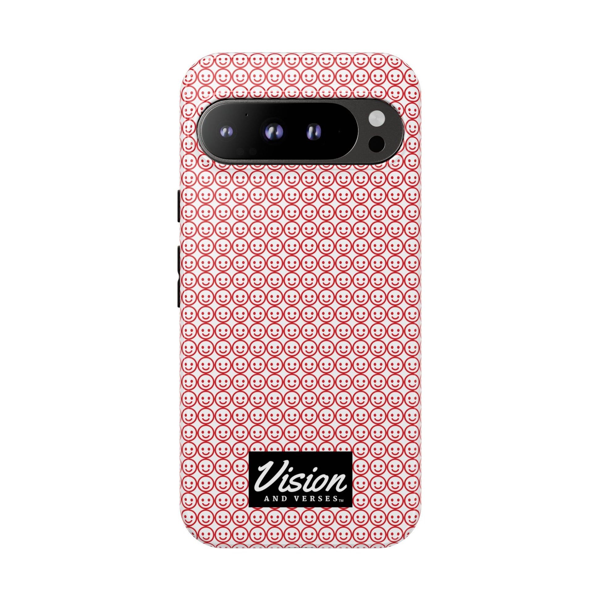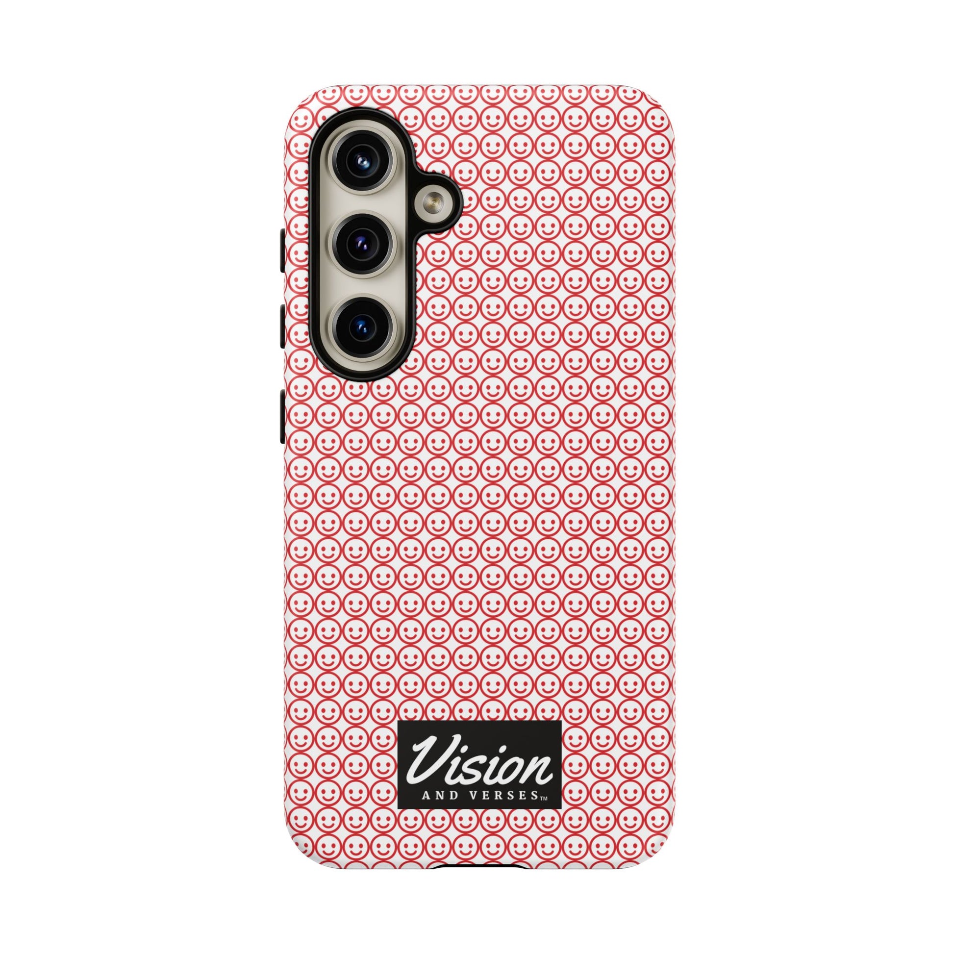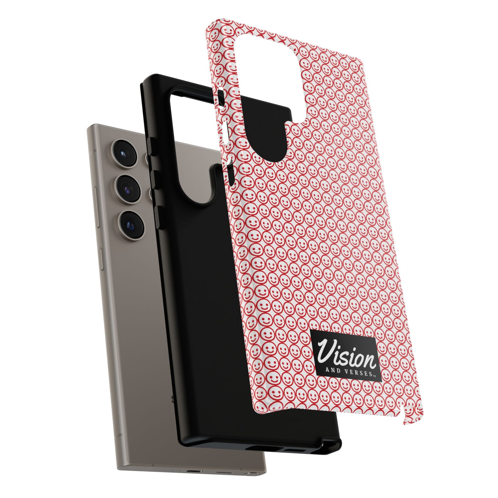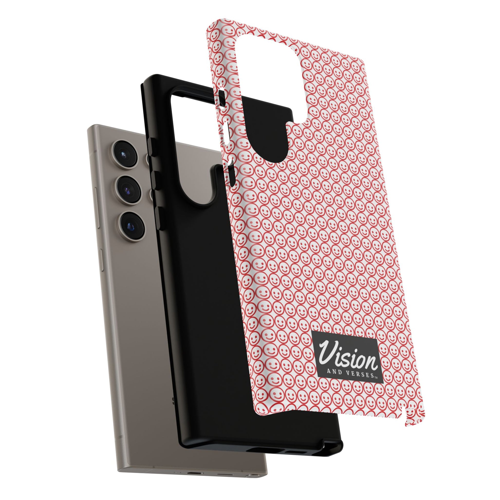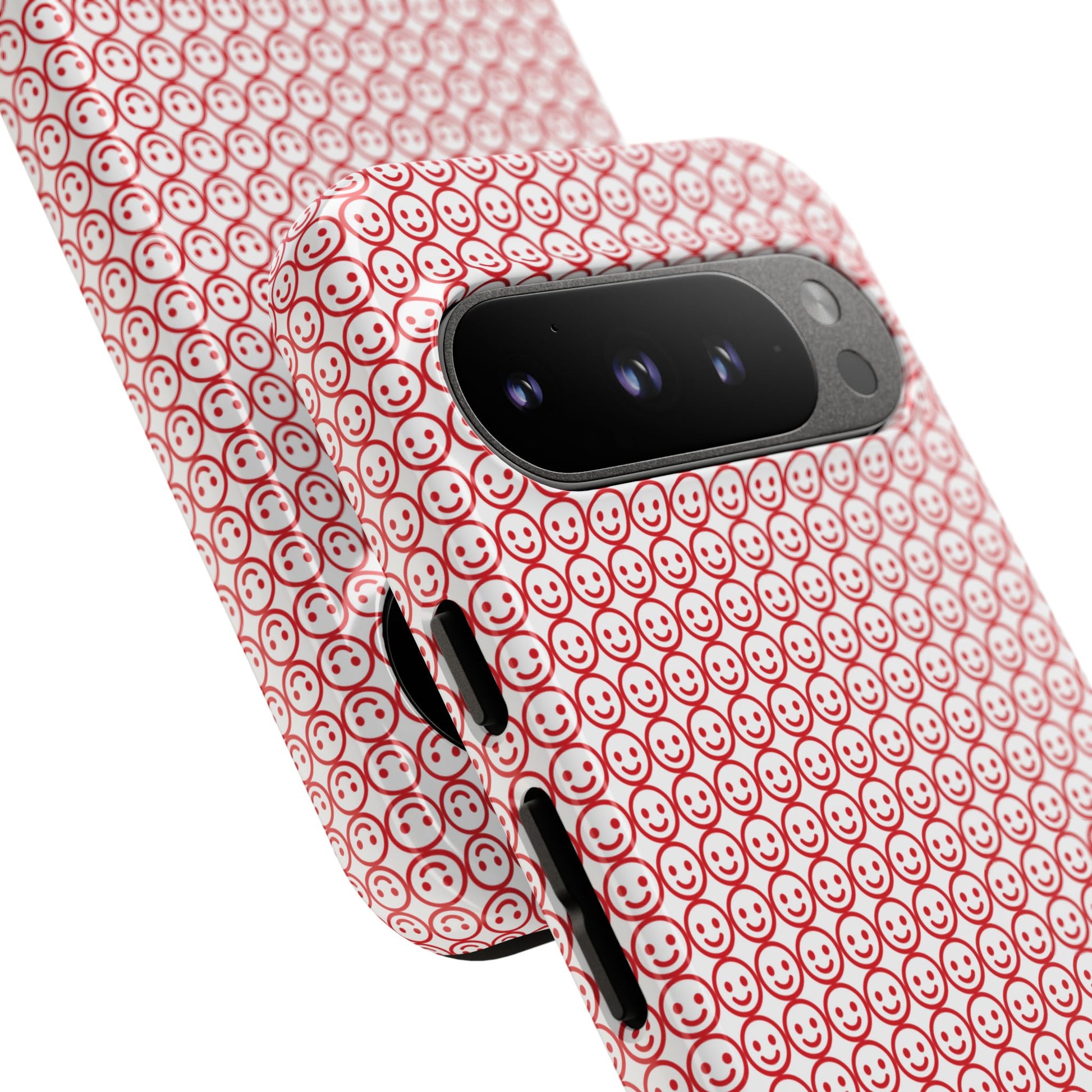 This slim yet rugged phone case brings playful energy to your everyday carry. A dense field of tiny smiley faces wraps edge-to-edge in a saturated red and white print, turning your device into a cheerful statement without sacrificing protection. The dual-layer construction — a hard polycarbonate shell with a soft TPU silicone liner — cushions impacts while keeping ports accessible and wireless charging available. UV-resistant inks preserve the lively pattern outdoors, and the glossy or matte finishes let you choose the exact look and feel you want. Thoughtful durability and certified materials mean this case stands up to daily knocks while keeping a lighthearted mood in sight.