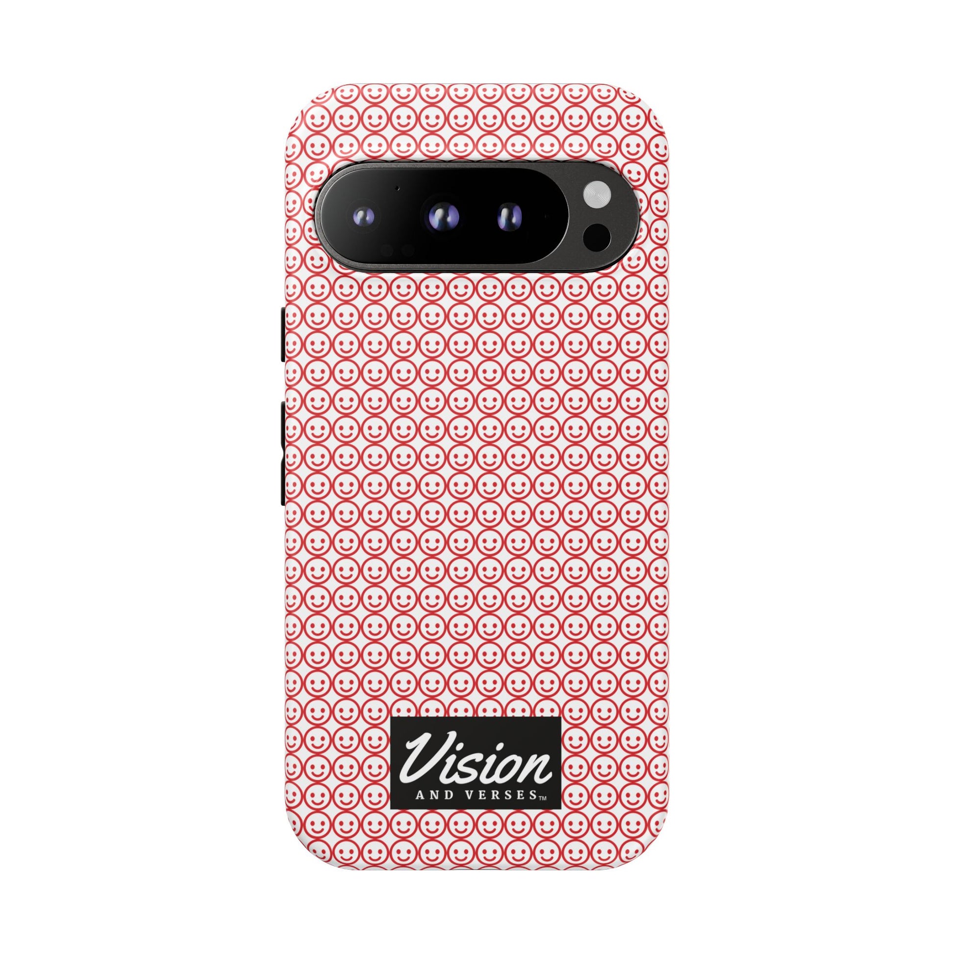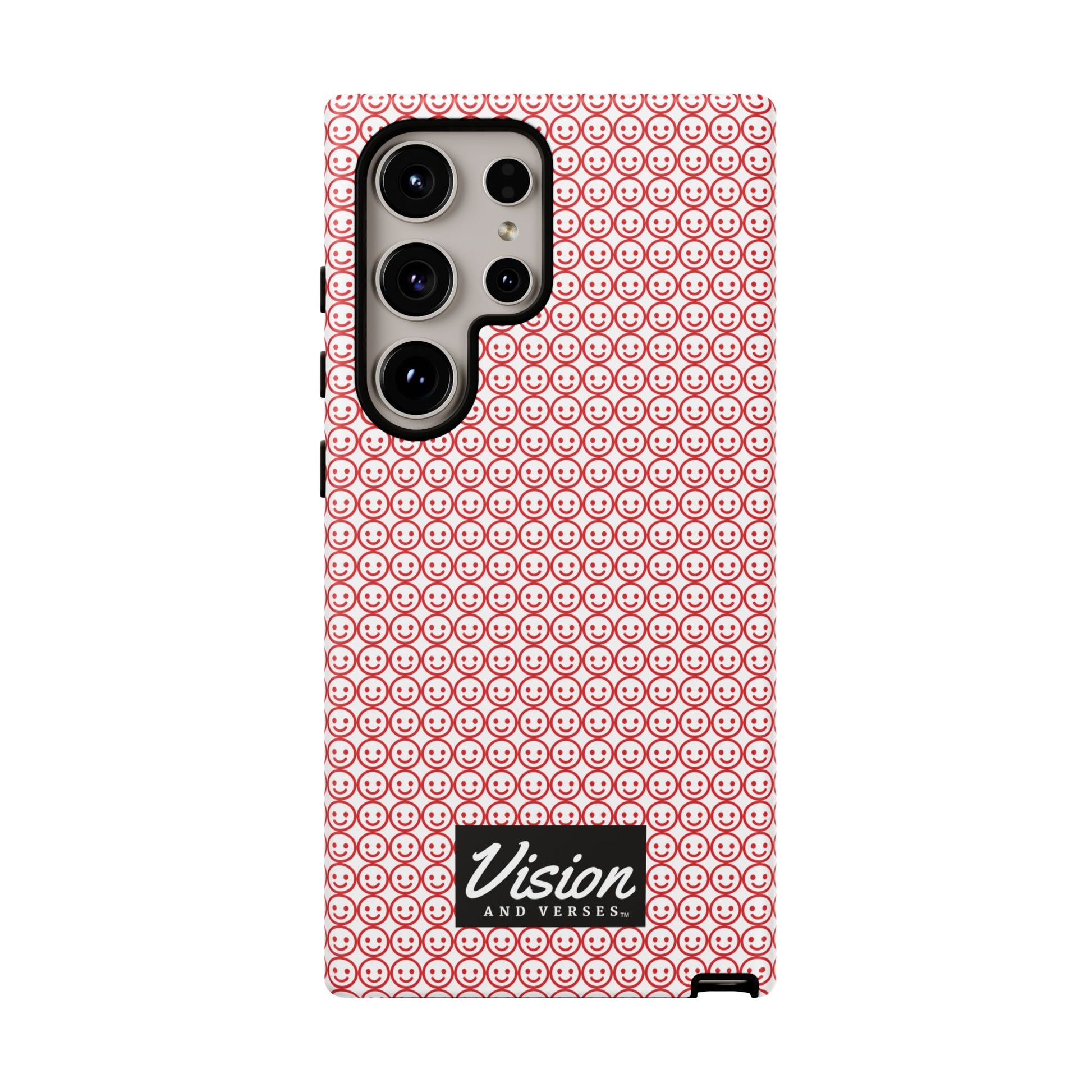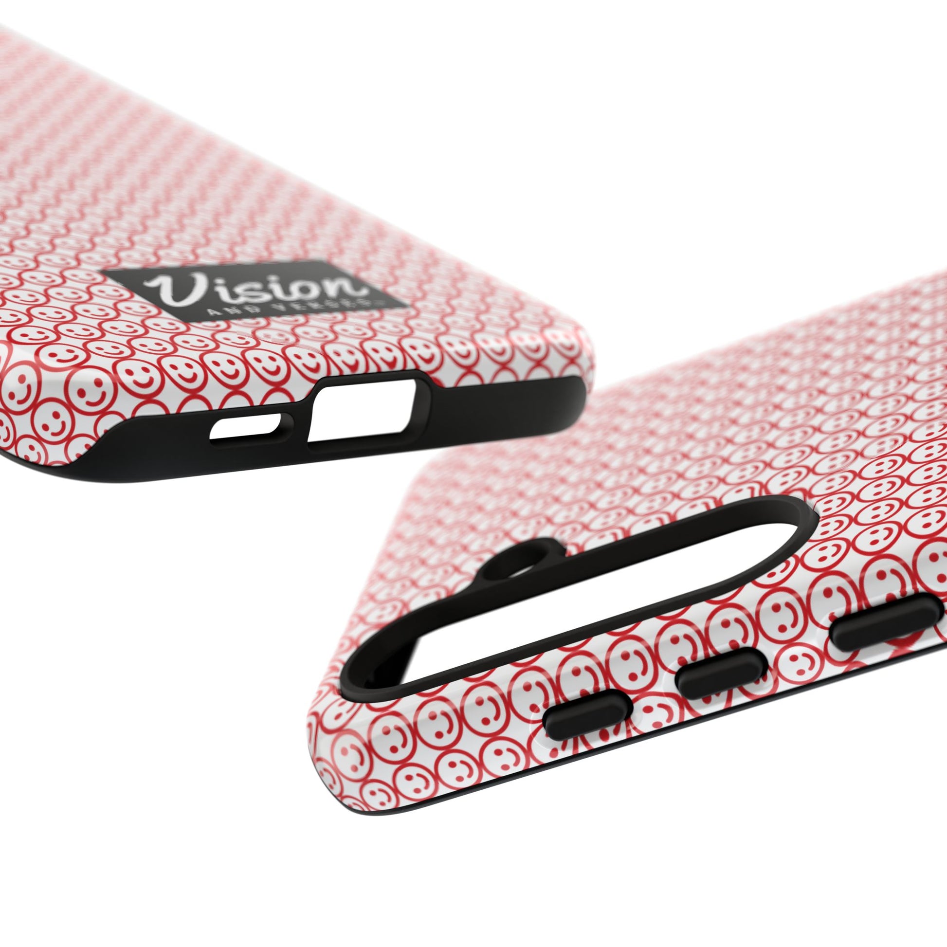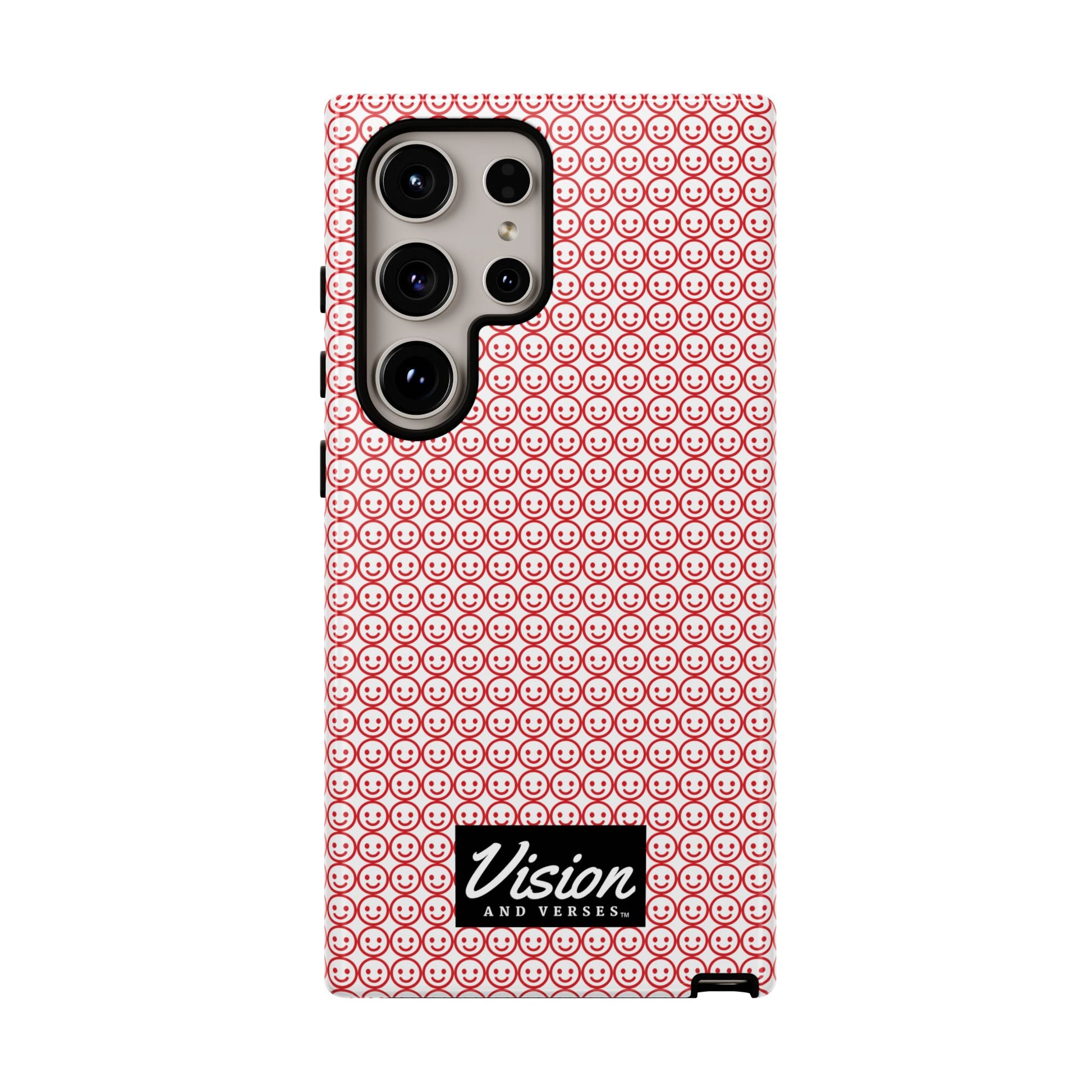 This slim yet rugged phone case brings playful energy to your everyday carry. A dense field of tiny smiley faces wraps edge-to-edge in a saturated red and white print, turning your device into a cheerful statement without sacrificing protection. The dual-layer construction — a hard polycarbonate shell with a soft TPU silicone liner — cushions impacts while keeping ports accessible and wireless charging available. UV-resistant inks preserve the lively pattern outdoors, and the glossy or matte finishes let you choose the exact look and feel you want. Thoughtful durability and certified materials mean this case stands up to daily knocks while keeping a lighthearted mood in sight.